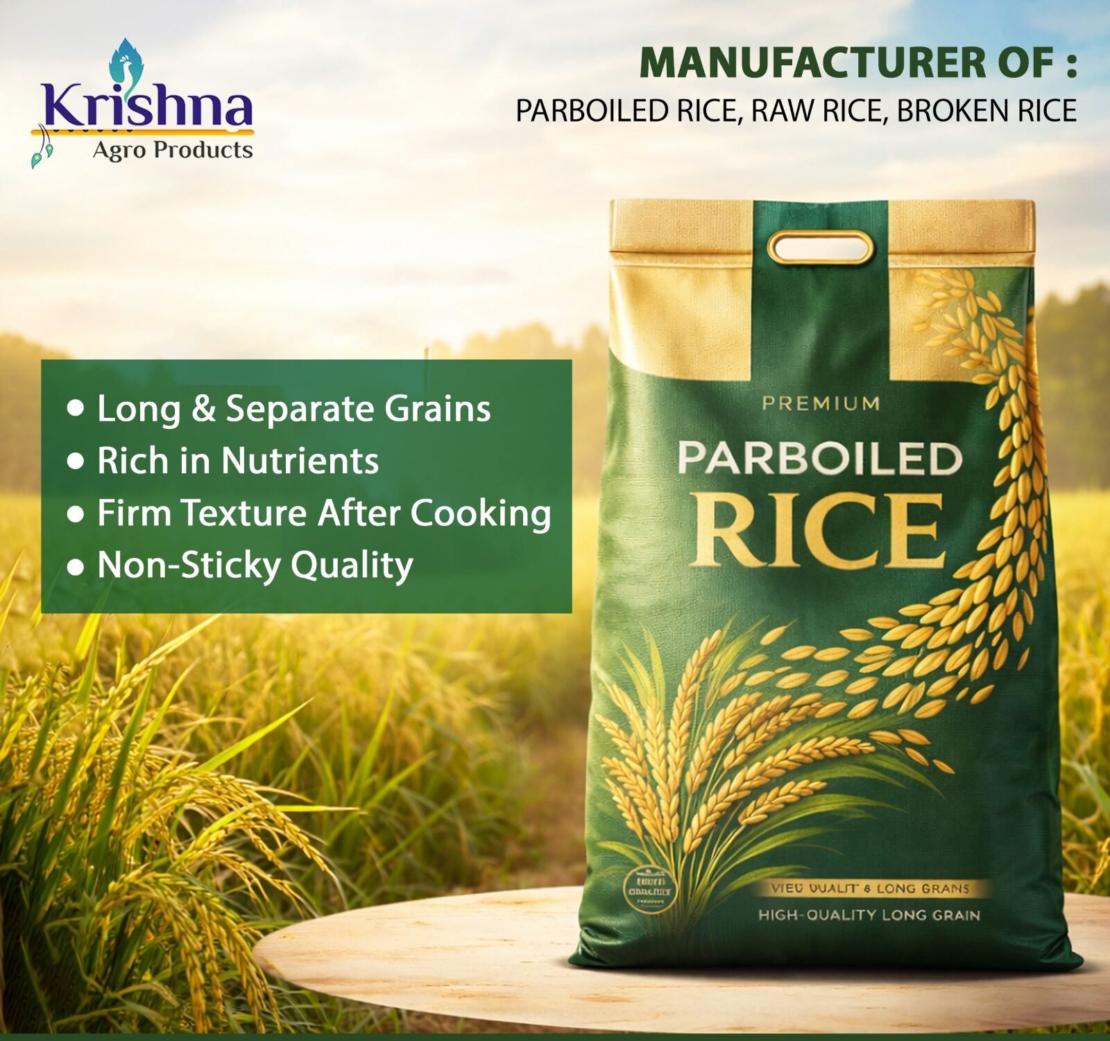 Welcome to Krishna Agro Products, a trusted manufacturer of high-quality Parboiled Rice, Raw Rice, and Broken Rice. With a strong commitment to purity, taste, and consistency, we bring you rice that meets the highest standards of quality and hygiene.