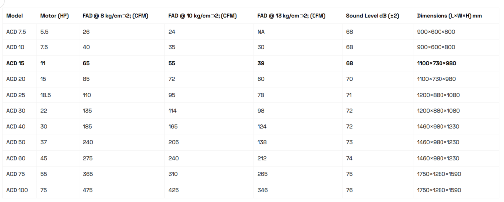 perfect solution for large-scale manufacturing, fabrication workshops, and industries requiring uninterrupted compressed air. The ACD 15 combines rugged