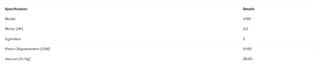 The 2.0 HP Vacuum Pump — Model \/135 is a high-performance, dual-cylinder vacuum pump engineered for powerful suction and reliable operation. With a piston