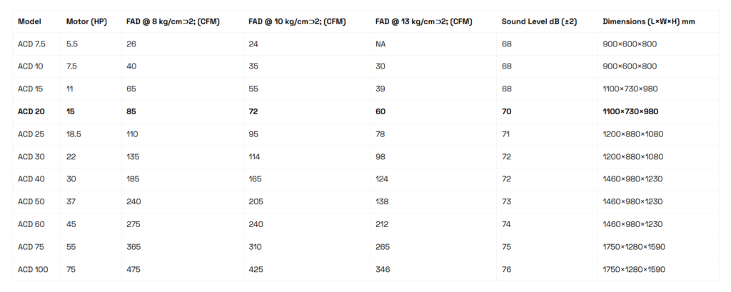 duty, round-the-clock industrial usage, the ACD 20 provides a dependable compressed air solution for production lines, fabrication shops, and processing plants.