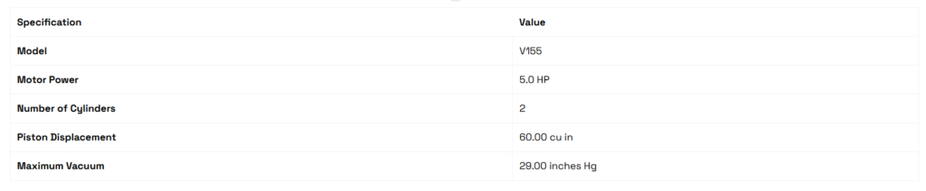 The V155 model represents a powerful and reliable vacuum solution tailored for high-demand operations. Designed with a robust 5.0 HP motor and dual-cylinder