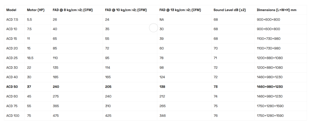 Built tough for 24/7 operations, this compressor is an excellent fit for large-scale manufacturing plants, fabrication workshops, and processing facilities. The ACD 50
