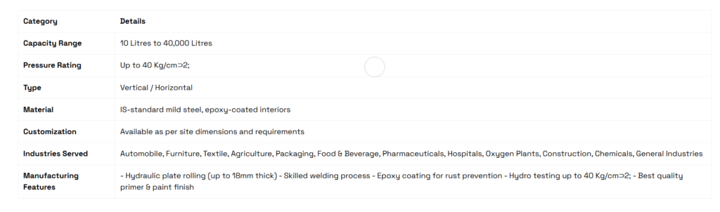 Our Air Storage Tanks come in capacities ranging from 10 liters to 10,000 liters and can handle pressures up to 40 bar, making them ideal for a wide range of