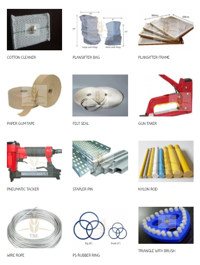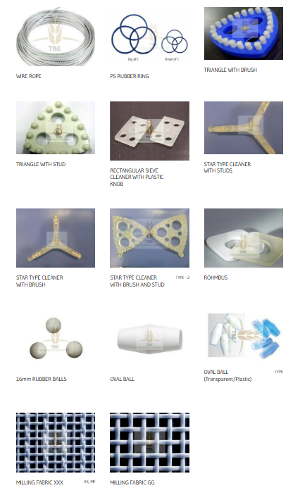 Plansifter accessories include a wide range of components that ensure smooth operation, effective cleaning, and long life of sieve machines in flour mills. These include fastening and sealing items like paper gum tape, felt seals, stapler pins, gun and pneumatic tackers; support parts such as nylon rods, wire ropes, and PS rubber rings; along with various sieve cleaners like triangular, rectangular, star-type, and rhombus cleaners with brushes or studs, as well as rubber and oval balls that prevent clogging and maintain efficient sifting. Together, these accessories play a vital role in maintaining hygiene, reducing downtime, and improving the overall performance of milling equipment.